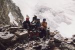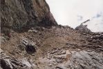 Подъем по морене на верхнюю террасу, между старыми моренами и моренами северного ледника п. 5148. Движение по средней осыпи 25-30º, косой траверс склона с плавным набором высоты. Перепад высот от реки до верхней террасы 300 м. Здесь отличные места для лагеря. Обед. | |