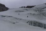 Путь в направлении правой боковой морены по открытой части ледника, лед 5-15º. Далее в связках подход под перевальный взлет по ровной закрытой части ледника. Ночевка. |  |