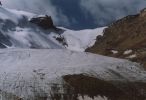 Движение по пологой части ледника, спуск на плоский участок морен, у языка ледника. Путь по левой части ледника, здесь меньше трещин. Выход на морены в левой части, прямо у языка ледника. Под языком ровные места для ночлега. |