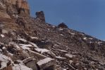 От кармана подъем прямо влоб на гребень правой морены, средняя осыпь, 30-35?, короткие участки до 40?, ок. 100 м. Выход на ледник между гребнем правой морены и правой стеной цирка.